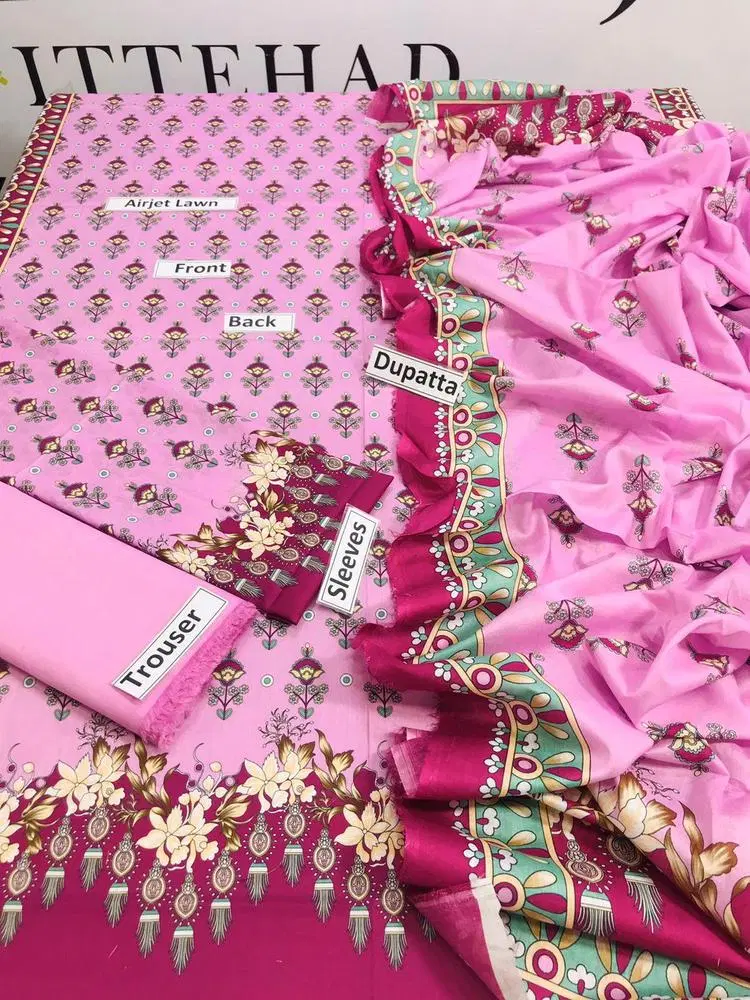 Shop 3 Pcs Women’s Unstitched Lawn Printed Suit, featuring beautiful prints on soft, breathable lawn fabric. Includes unstitched shirt, trouser, and dupatta. Perfect for casual, daily, and semi-formal summer wear. Add freshness and color to your wardrobe — order now!