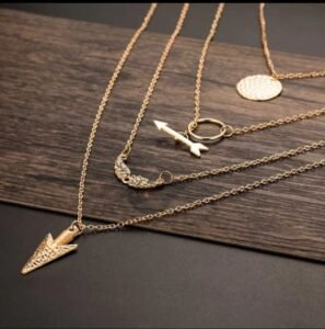 - This necklace is a stunning piece of jewelry that is perfect for any woman. It is made of golden alloy and features a bohemian style design. The necklace has four layers, with each layer consisting of a delicate chain adorned with small arrow pendants.
